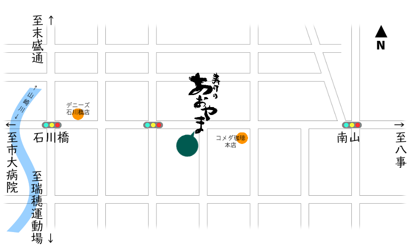 石川橋交差点を八事方面へ、信号1つ越えたすぐ右側 緑色の看板が目印です